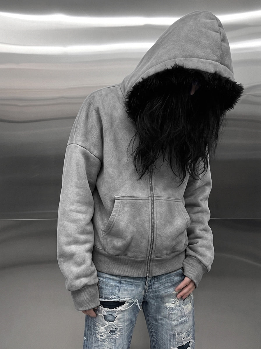 WASHED YETI FUR REVERSIBEL ZIP HOODIE JACKET